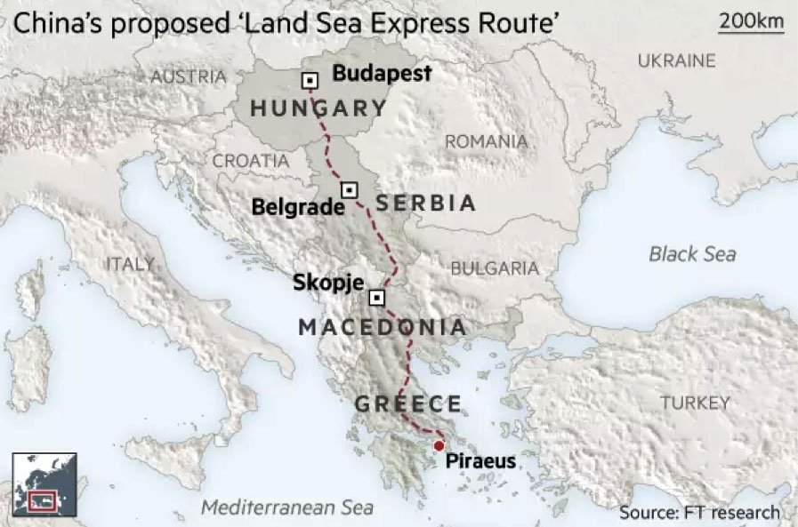 Lo sviluppo del Pireo, grazie al quale Pechino spera di accrescere le sue esportazioni verso l’Europa sudorientale e centrale, richiede vie di trasporto attraverso i Balcani. Per collegare il Pireo all’Europa centrale la Cina ha proposto un progetto di ammodernamento di 350 chilometri di linee ferroviarie tra Belgrado e Budapest, al momento al vaglio dell’Unione Europea. La Cina ha inoltre finanziato progetti stradali, energetici e commerciali in tutti i Balcani.