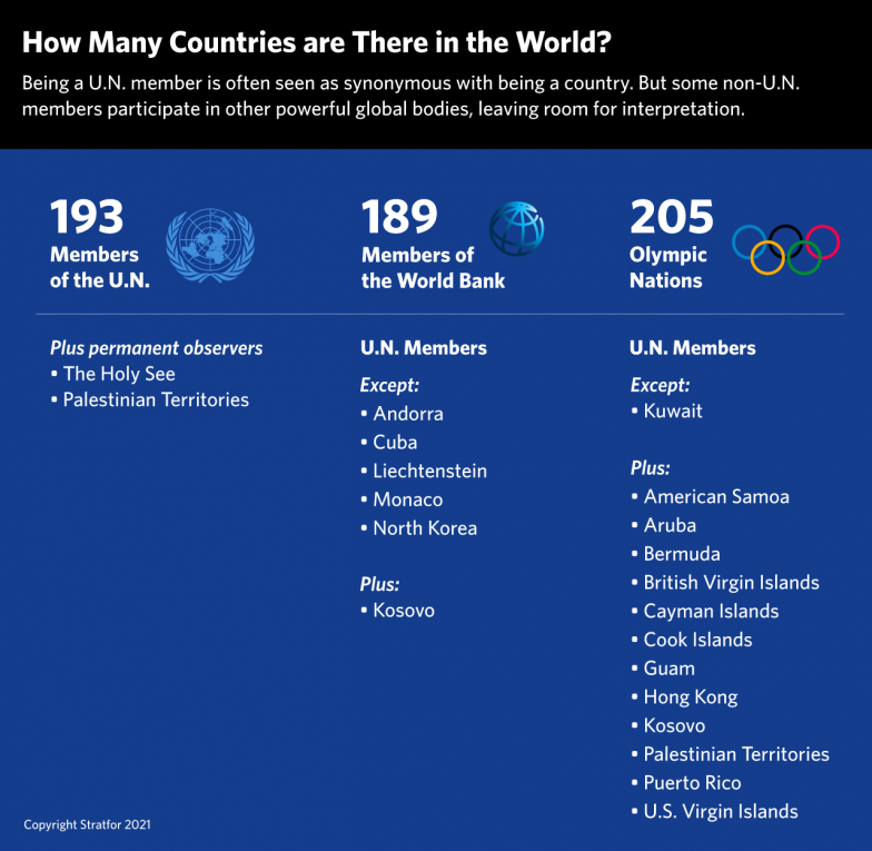 La Banca Mondiale adotta ancora altri criteri e non accetta come stati Andorra, Cuba, Liechtenstein, Monaco e la Corea del Nord, tutti membri dell’ONU, perché non aderiscono a criteri internazionali di sovranità monetaria. È invece membro della Banca Mondiale il Kosovo, che l’ONU non ha ancora riconosciuto come stato.