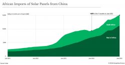 Lo sbocco principale di esportazione è l'Africa, dove il 43 % della popolazione, circa 600 milioni di persone, non ha ancora accesso a un'elettricità affidabile. Le aziende di servizi pubblici sono spesso insolventi, le reti elettriche inaffidabili, i generatori diesel colmano il divario, ma a costi proibitivi. Le mini-reti solari cinesi in Nigeria, durante un programma pilota, hanno fornito energia a 0,16 dollari/kWh, con costi iniziali recuperati entro sei mesi. Da giugno 2024 a giugno 2025 le importazioni africane di pannelli solari cinesi sono aumentate del 60%, passando da 9,4 GW a 15 GW. Il Sudafrica è stato il principale acquirente, con 3,7 GW. La crescita percentualmente più significativa si è verificata in Nigeria e Algeria. È un commercio altamente redditizio per Pechino, che lega l'economia africana alle catene di approvvigionamento cinesi e genera anche buoni rapporti politici.
