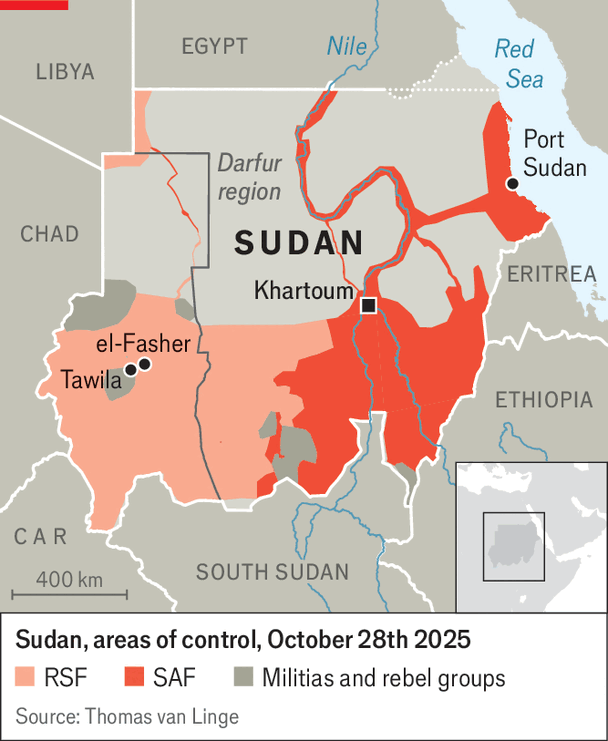 Di fatto il Sudan è già diviso in quattro regioni, ma quasi certamente si sgretolerà ulteriormente. L'accordo di pace di Juba del 2020 prevedeva la divisione del Sudan in tre stati semi-indipendenti – Darfur, Kordofan del Sud e Nilo Azzurro – oltre agli stati controllati dal governo centrale di Khartoum a nord, centro ed est. Il piano, supervisionato dagli Emirati Arabi Uniti, è fallito.