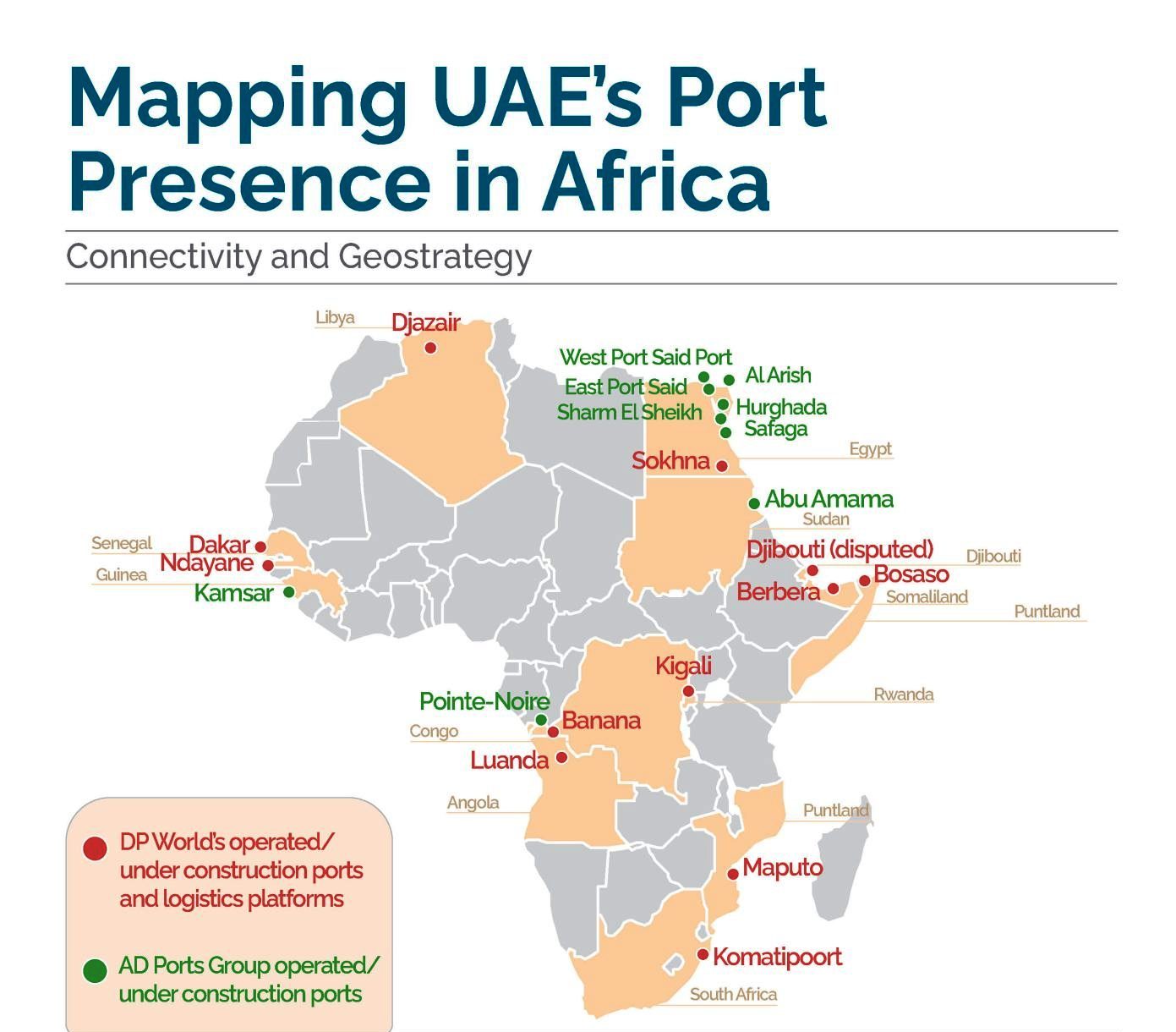 In sostanza, gli Emirati Arabi Uniti vogliono dominare il mercato alimentare in Medio Oriente e in Africa ed avere una quota rilevante nel mercato delle materie prime, il che richiede il controllo sui porti lungo la costa del Mar Rosso e in generale dei paesi africani più ricchi di risorse. Aspirano a costruire una rete marittima che superi quella dell'Impero omanita, che fiorì nel XVIII e XIX secolo.